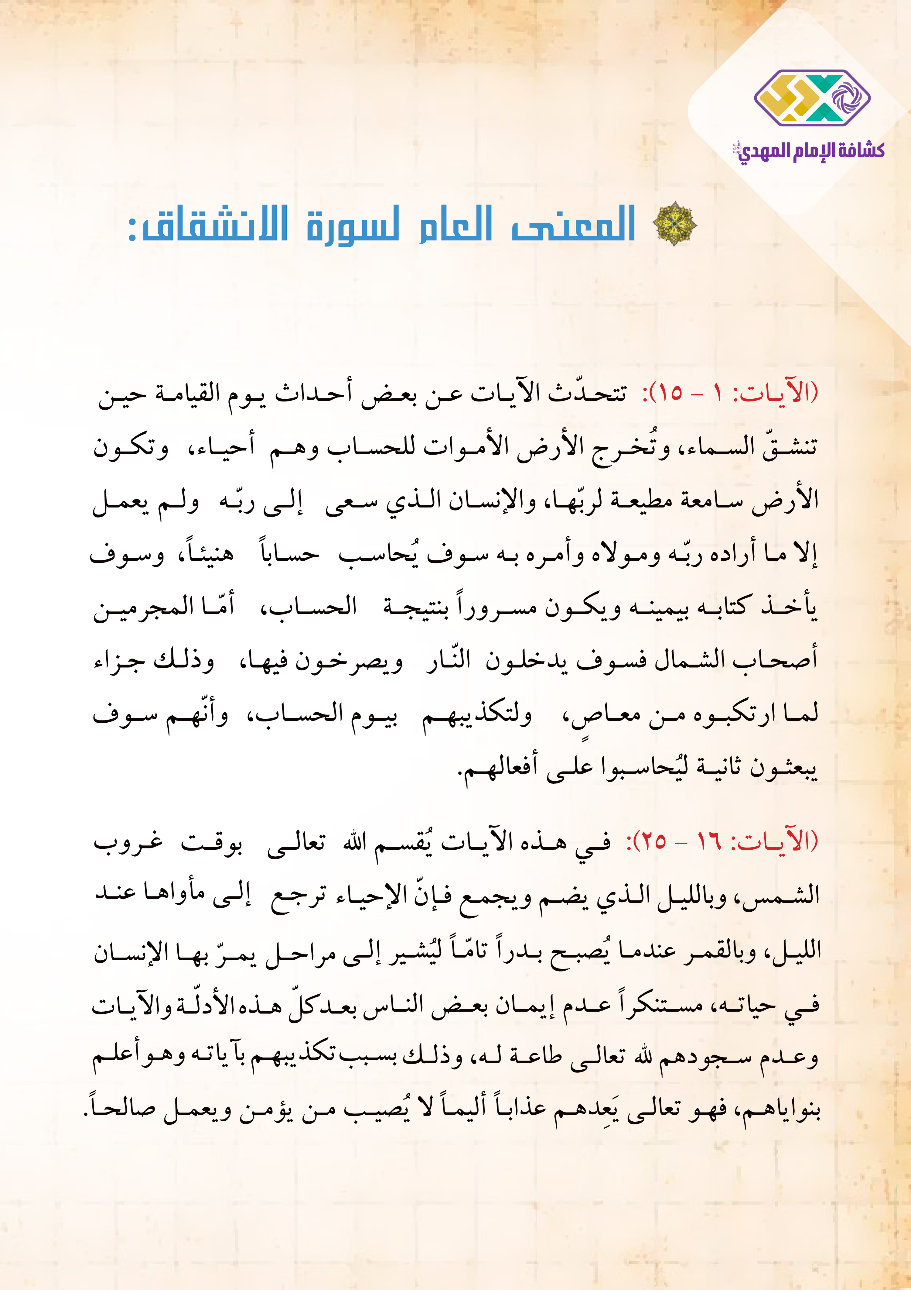 1. أتعرّف إلى المعنى العامّ لسورة الانشقاق.