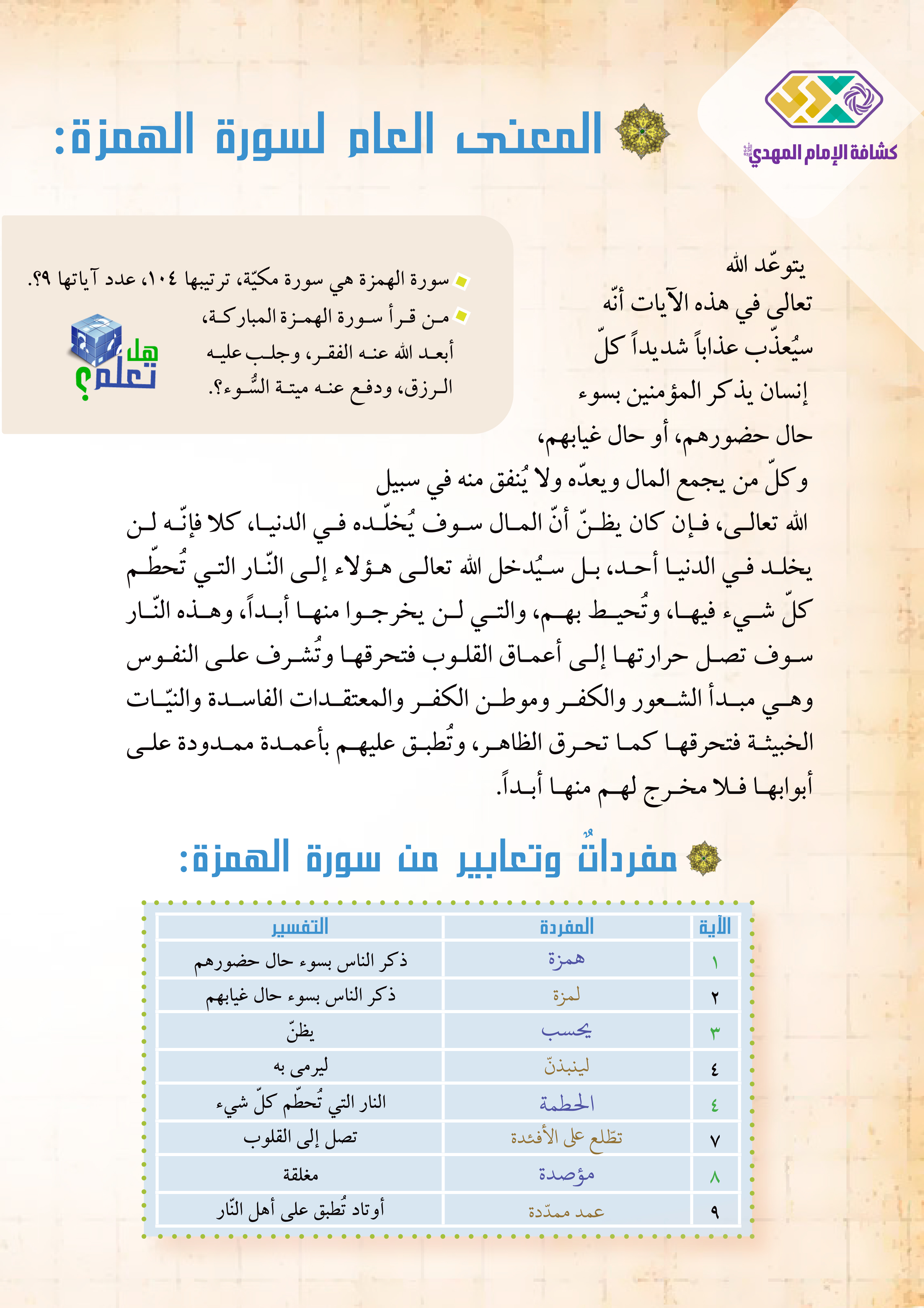 1. أتعرّف إلى المعنى العامّ لسورة الهمزة.