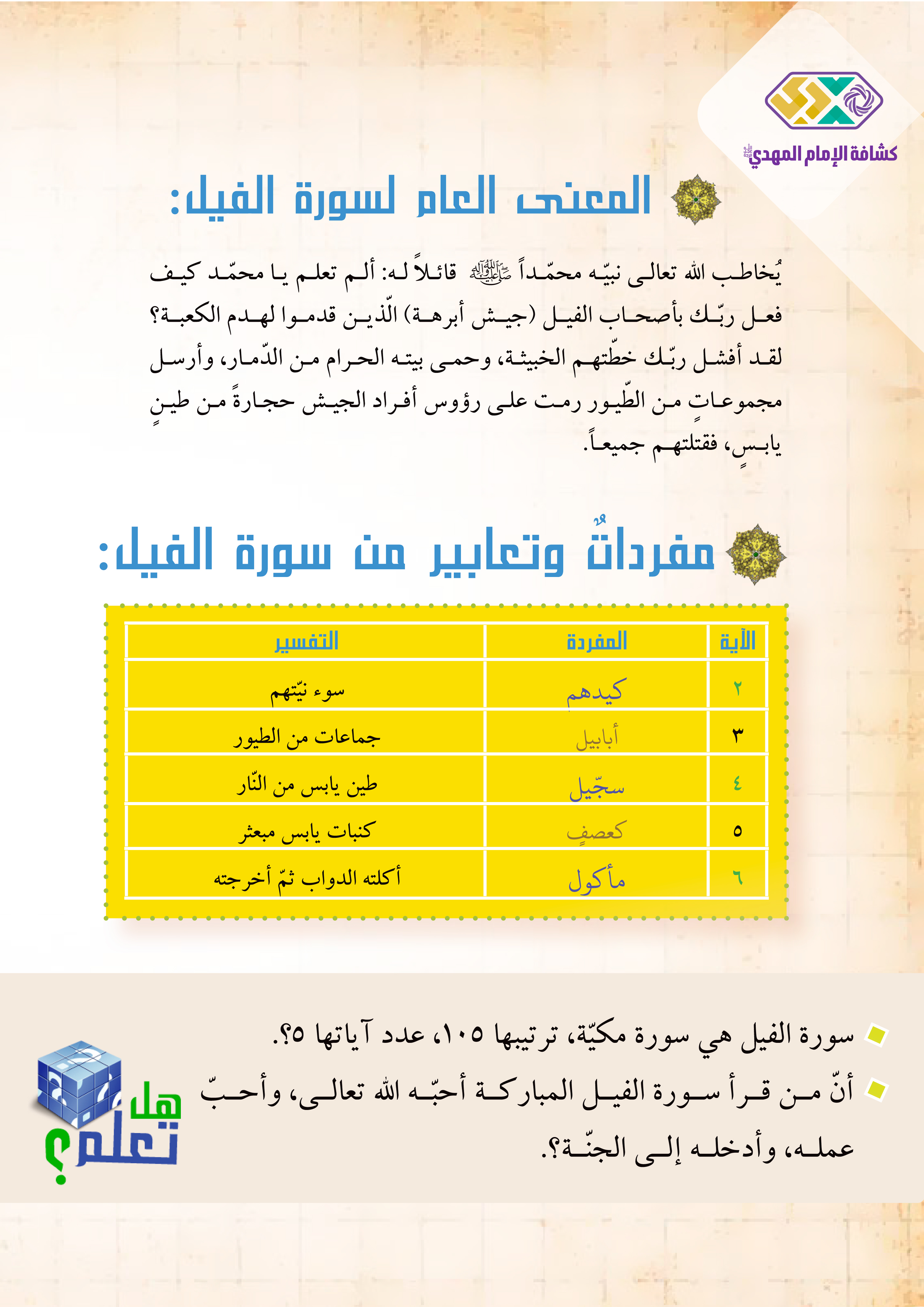 1. أتعرّف إلى المعنى العامّ لسورة الفيل.