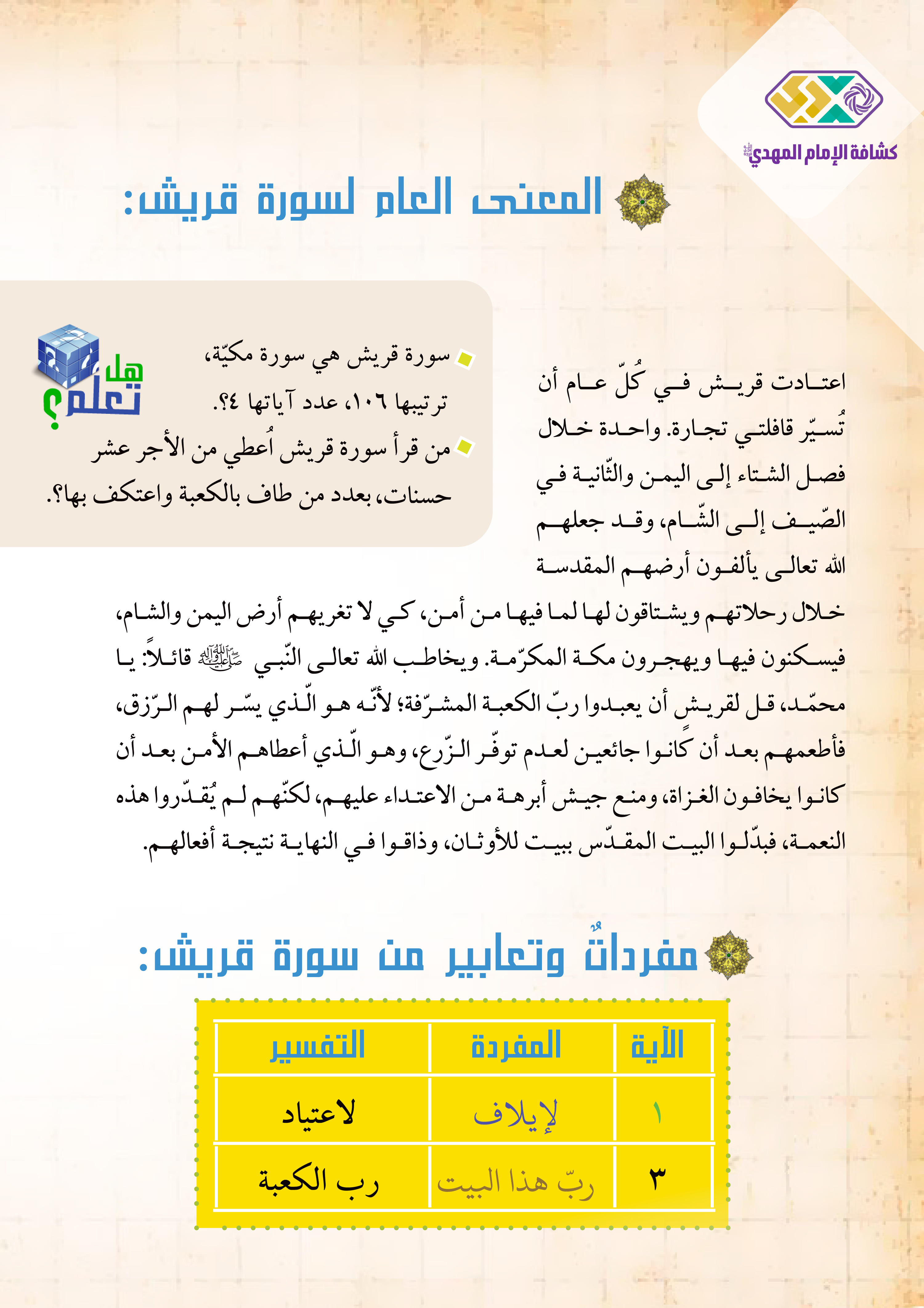 1- أتعرّف إلى المعنى العامّ لسورة قريش.
