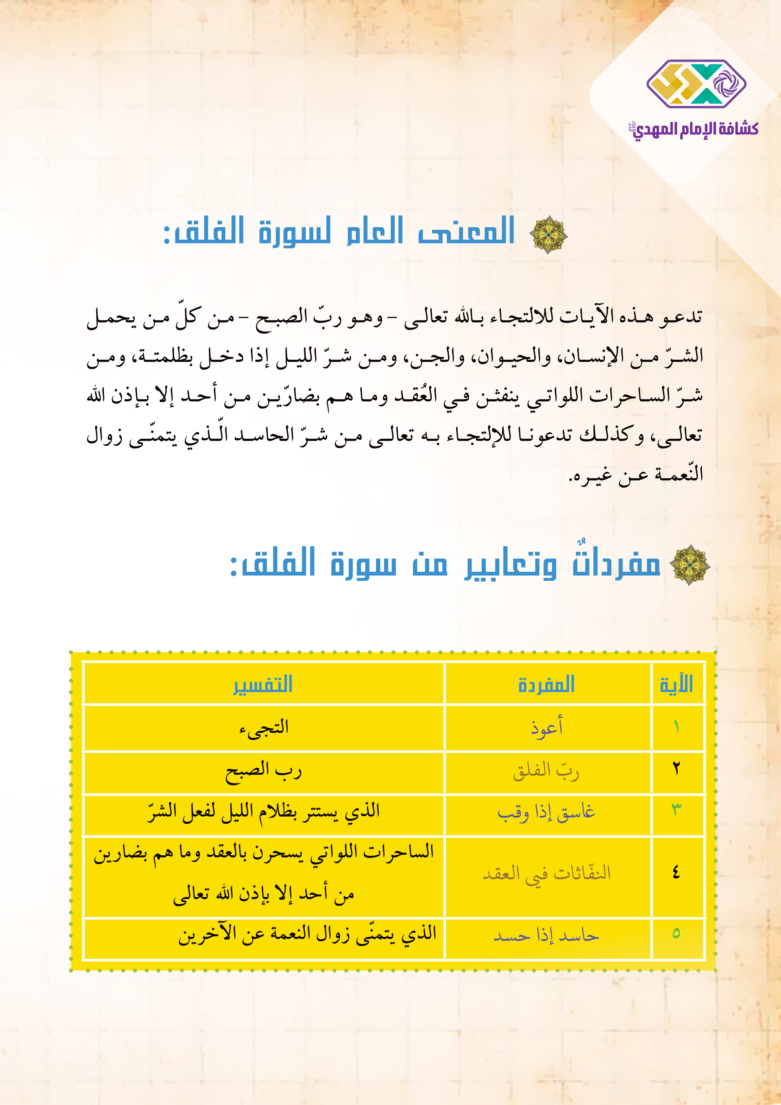 1. أتعرّف إلى المعنى العامّ لسورة الفلق.