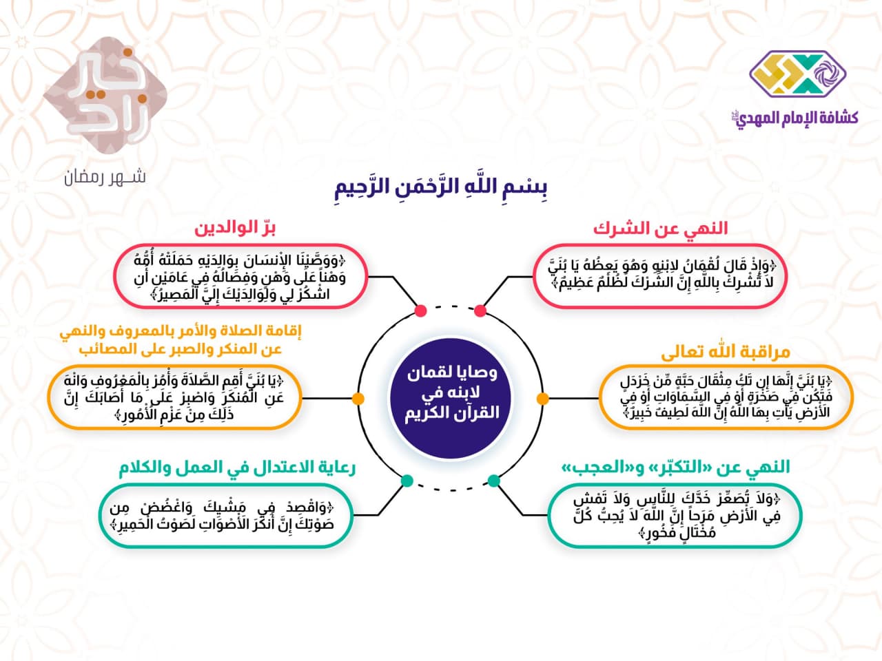 يعدّد أربعًا من وصايا لقمان عليه السلام لولده كما وردت في القرآن الكريم. (كشافة: 20، مرشدات: 20)