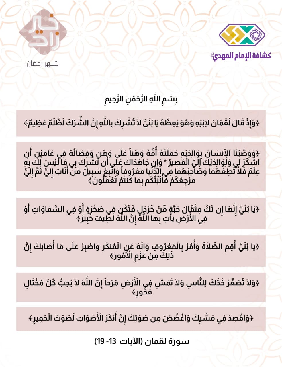 - يُفتتح النشاط بتلاوة آيات مباركة من سورة لقمان (الآيات 12- 20) من قبل أحد المشاركين. (يتفق القائد معه على تحضير التلاوة قبل بداية النشاط).
