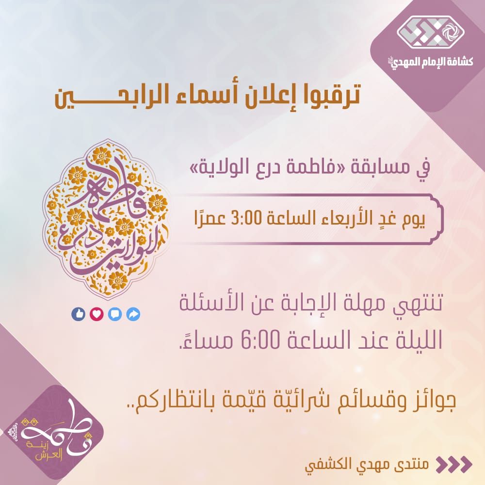 ترقبوا إعلان أسماء الرابحين في مسابقة - فاطمة درع الولاية